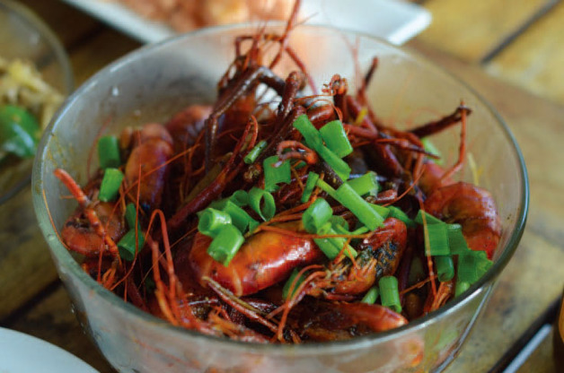 原先我会做拍黄瓜,但王老师不吃辣,后来就试着用黄瓜丝拌豆腐皮,不加酸,不放辣,只入一点晾凉的熟植物油,生大蒜末,少许盐,少许糖,拌匀冷藏,黄瓜的清香和豆皮浓郁的黄豆香气,再有生大蒜的气味,仿佛就是菜市场买来的凉拌菜一样好吃了。红烧猪肘热天大概没人爱吃,于是放在卤汁里慢慢炖一个上午,晾凉后撕成小块的肉,同样冷藏,再算上三文鱼、绿豆沙,凉菜占去一半。另外几个热菜是西红柿炒蛋、爆炒猪肚、炸丸子汤和烤鸡翅,不过谢总去小溪那边取了好几十只虾回来,怕吃不完,鸡翅便没有再烤。