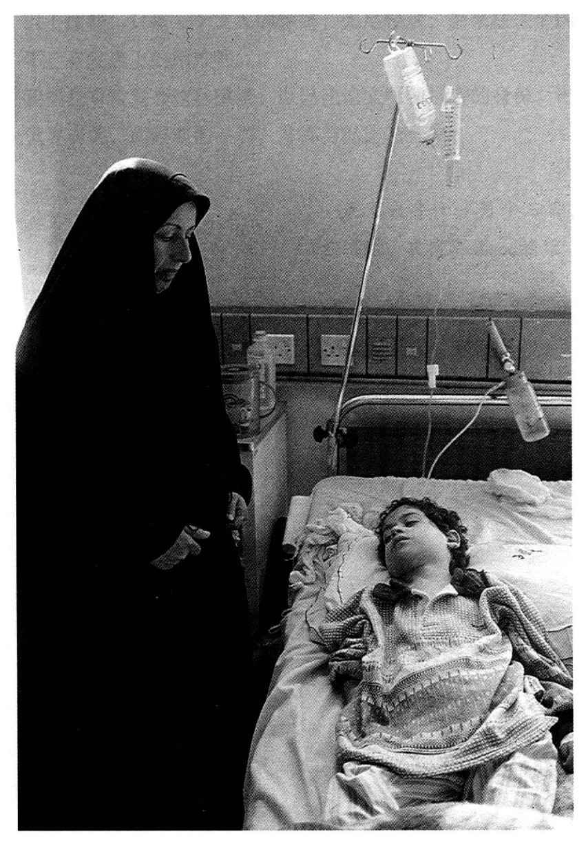 我们想给病房里的每位母亲留点钱,但刚摸出,就被医院负责人严词阻止。我只得走出病房,在走廊里徘徊。走廊里,贴着很多宣传画,都以儿童为题材。一幅的标题是:“禁运杀害伊拉克儿童”;另一幅的标题是“记住”,画了一双婴儿的大眼。