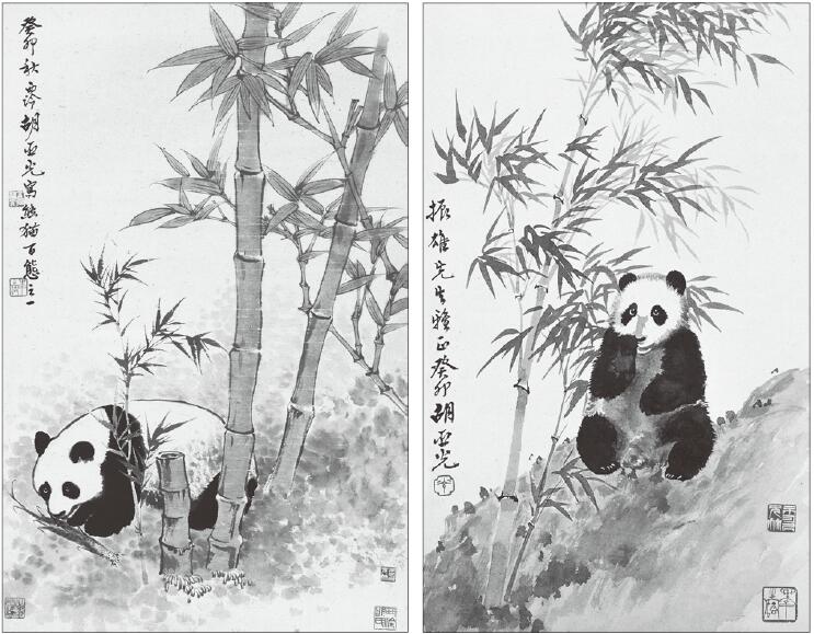 我国特产熊猫,海外友邦视为珍稀之兽,亚光也就画起熊猫来了。同时画熊猫的,北方尚有吴作人,因有北熊猫、南熊猫之称。亚光所作,都以竹林为背景,钤有“不可一日无此君”七字印章。原来熊猫喜啖竹叶,亚光即取王子猷爱竹语双关,别饶趣致。亚光所用茶壶杯盘,被单毛巾,都是选择有熊猫图纹的,甚至把儿童的熊猫玩具,也累累地陈设在玻璃橱内,作为欣赏。那熊猫的纪录片,不知看了多少遍,简直成为熊猫迷。