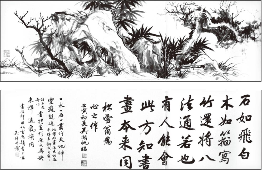 湖帆不仅工画山水,松、竹、芙蕖也都擅长。有时画马画牛,更以稀见为贵。有一幅五牛图长卷,牛或仰或俯,或回顾,或正立,非常得势,线条又复刚柔兼施,确是精构,现藏其门人黄秋甸处,有湖帆跋语,如云:“戊子冬日,秋甸贤弟,助余经纪先慈迁葬祖茔,往返跋涉,殊代余劳,无以为答,因检旧作赠之。”总之,湖帆笔墨,劲饶有古意。破损的古画到他手里,就先请装池圣手刘定之精裱成轴,然后再亲自填补添笔,往往天衣无缝,无迹象可寻。