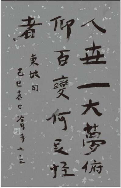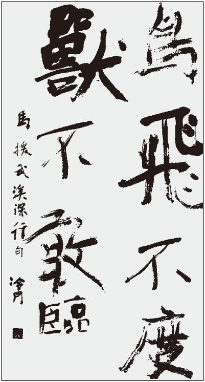 他每天临池,无论怎样忙,总得挤出半天时间来挥洒。他能用大笔写小字,用湿笔或枯笔写条幅,无不掌握如意。他又认为前人作书,质胜于文,今人作书,文胜于质,应当把两者扭成一起,使质中有文,文中有质,经常有变化,有变化才得进步,才得创新。他赴日本大阪,参加书法交流会,日本人就钦佩他书法的变化无穷,有似神龙茫洋于云端,令人不可捉摸。我看到他行书所写辛稼轩词,隶书所写的刘禹锡诗,深赞他雅韵欲流,挹之不尽,他却谦抑地说:“书艺高比泰山,到了傲来峰,不能歇足,还得直上南天门,我正在加着劲攀登再攀登哩!”