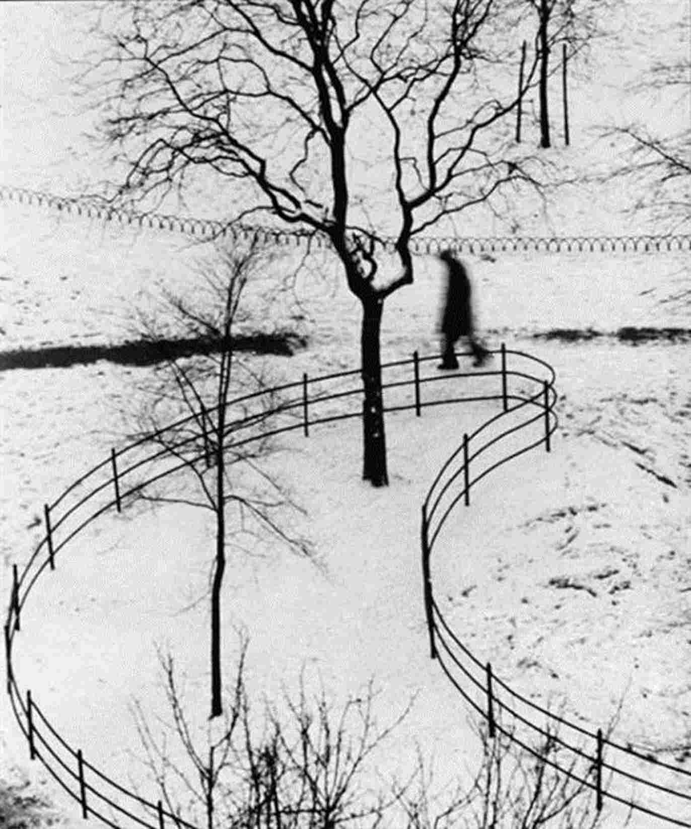柯特兹视线所及,就是自身处境的反射。在雪中行走变成一种孤独的形式和悲伤的表达,且试图从中提供慰藉。大雪将城市变成荒野;公园因之成为广阔的中部平原——匈牙利的平原。柯特兹照片中穿大衣的男人踉跄地走过雪地,因背景的壮阔而相形见绌。他们来到可信任的长凳前,那是他们通常休息的地方,却发现它们不再是长凳而是某种城市的雪栅栏。因为雪将长凳据为己有,他无处可坐(并非故意,只因雪渐渐飘落),只有继续前行。