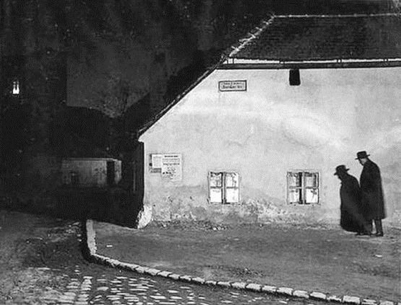 人们常常把这一图像特别和柯特兹的中老年联系在一起,尽管这些人物首先在其年轻时的作品中闪现。我们遇见他们……让我这么说吧:我们遇见这个人物——因为只有一个而已,通过大衣和礼帽立即得到辨识,而淡忘了其他典型特征——1914年独自夜行在布达佩斯的鹅卵石小径上[41]。加缪说我们在夜间看到鸟类总是以为它们在归家,但当看到柯特兹照片中裹着大衣的男子时,我们却未有过这样的感觉。没有亮灯的窗户在召唤。不,是街道本身,是踯躅的行动,事实上是大衣表现了家恒久不变的意味。即使那样,这个男子看起来像是他过往自我的阴影。他不能快速移动,也无法想象他曾经能够跑起来。然而在柯特兹开始拍摄这个男人的同时,他为其弟弟和自己拍摄了充满活力的照片,他们脱去衣服,几近全裸,互相比赛,充满了对运动的爱。甚至就在那时,柯特兹照片中体现出对未来以及一段和家人相处的时光的渴望也已带有怀旧意味,那些夏天和弟弟相处的美好时刻会变成回忆,衰退,保留在雪中独行的男人的头脑里,好像他们穿着拖鞋,踱步过街,在一个阴冷的医院病房中,忍受不知名的病痛,唯一治愈的方法就是不断行走。“那些日子的回响重返我身边,”卡瓦菲斯写道,