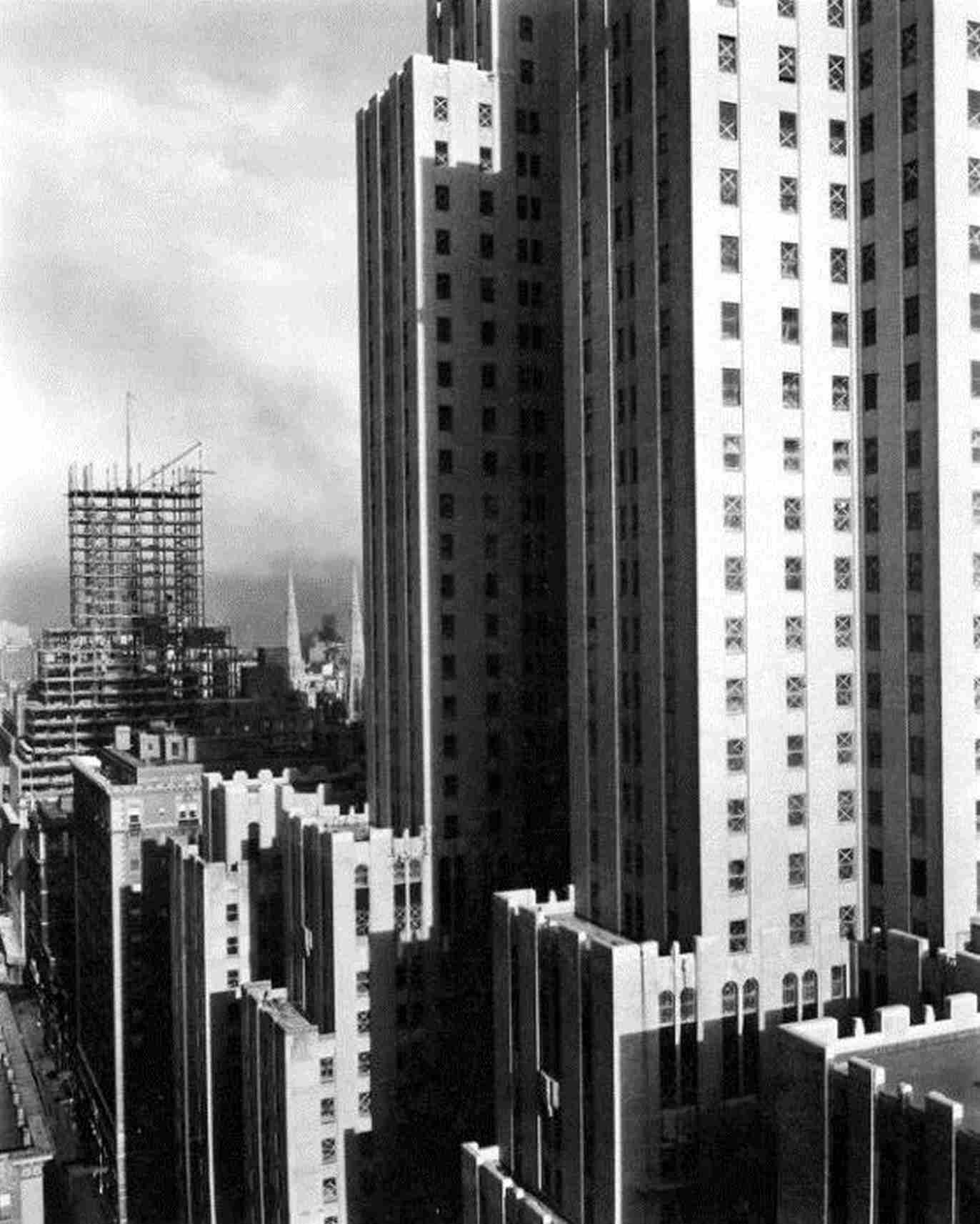 在谢尔顿酒店和“美国宫殿”画廊拍摄的照片记录了斯蒂格里茨对逐渐将他包围起来的建筑疯狂的修建速度的反应。视野得到极大扩展的同时也有所限制[46]。尽管在20世纪20年代的繁荣时期得到资助并进行规划,但工程的实施实际已到了大萧条阶段,这便激起斯蒂格里茨的抱怨:大量金钱涌入建筑项目而“艺术家们在挨饿”(这是典型的斯蒂格里茨,将资本主义的贪婪象征和挨饿的艺术家对立起来,而非工人或农民)。虽说他口头上抱怨着周围发生的事情,但照片本身显得冷静而超然。斯蒂格里茨不是抬高象征贪欲的塔式起重机,而是采用和他的拍摄对象平起平坐的视角。镜头下的建筑物是他早期观察的一部分。在他周围开始建设的摩天大楼成为实现其野心的对等物,也是献给摄影媒介令人炫目的颂辞。斯蒂格里茨为摄影的崛起倾注了诸多心血。他坚持认为:“如果在摄影这里发生的一切不能站得住脚,并压过摩天大楼那里发生的事情,那么这里的一切就没有存在的理由。”如果“在那里”挑战“在这里”但不能压倒之,前者便可以验证和确认后者。两者的竞争来自美学和象征层面,并接近抽象,结果就成为建筑和摄影之间联盟的自我补充。外部世界无法消除的威力真实反映了斯蒂格里茨审视能力的持久影响力。
