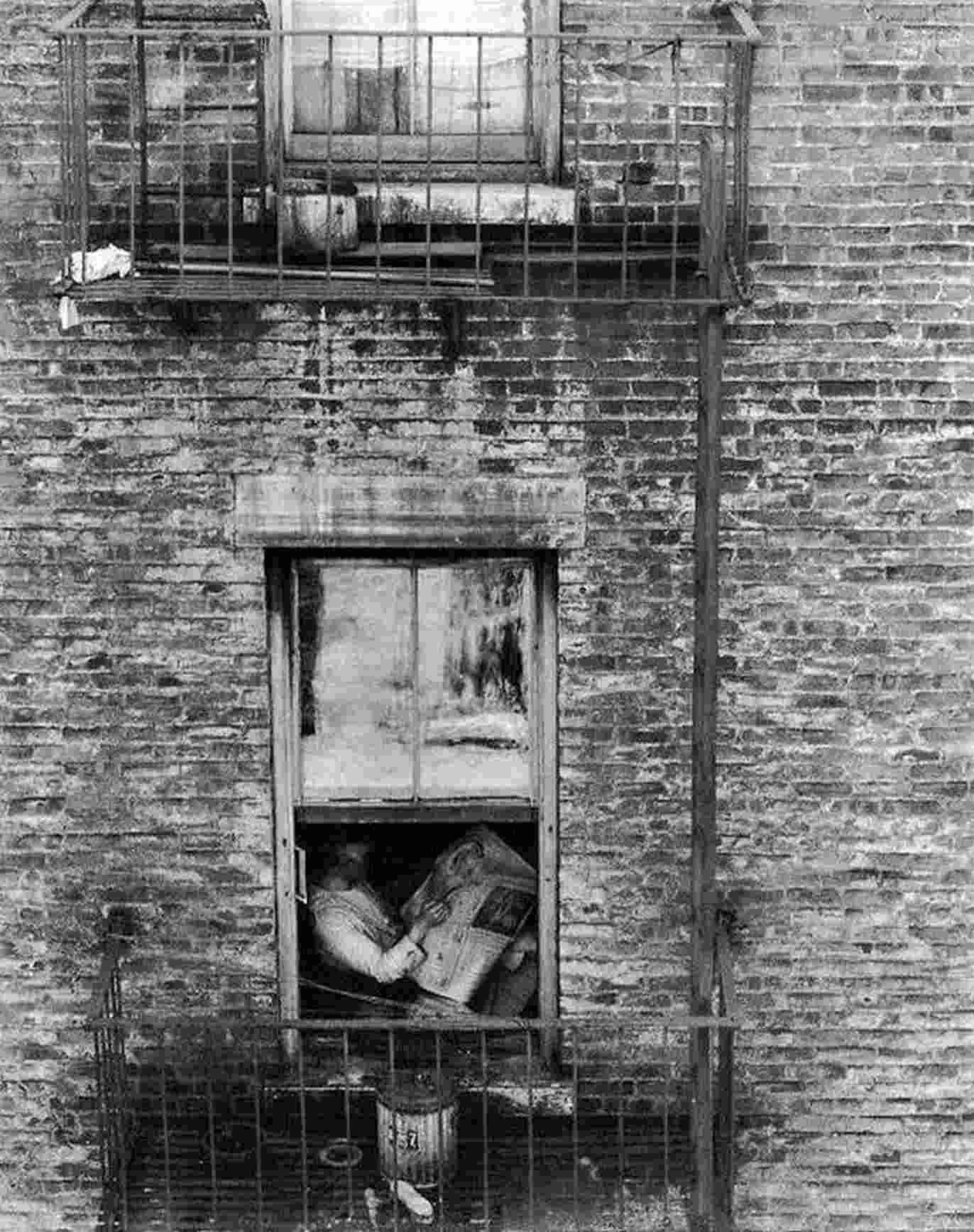 另一幅透过吸泰钦窗户的窗框看到的景象——如兰德尔·贾雷尔(Randall Jarrell)在名为《窗户》(Windows)的诗中所写:“一个人点头进入报章。”在爱德华·霍普(Edward Hopper)的画作中,人物看着通风又宽大的窗子,分享室外的明亮和宽敞。而一个男性蜷缩在小屋中,他几乎没有比埃文斯拍摄的地铁乘客有更多空间来读报纸。在几年后的1925年,史泰钦在第40号大街的某个窗户拍摄夜景,让城市建筑看上去有序、冷漠、荒凉。1922年的照片有着村庄随意的亲密感,可以说是城市生活容易忽略的一个方面。在报纸的周末版中,小方形窗户是围绕它的一排排无穷尽的砖瓦唯一的凸面部分[47]。从一扇窗见到的风景是另一扇窗,完全一样地单调。没有其他地方可看。即使你想转移目光也不行。