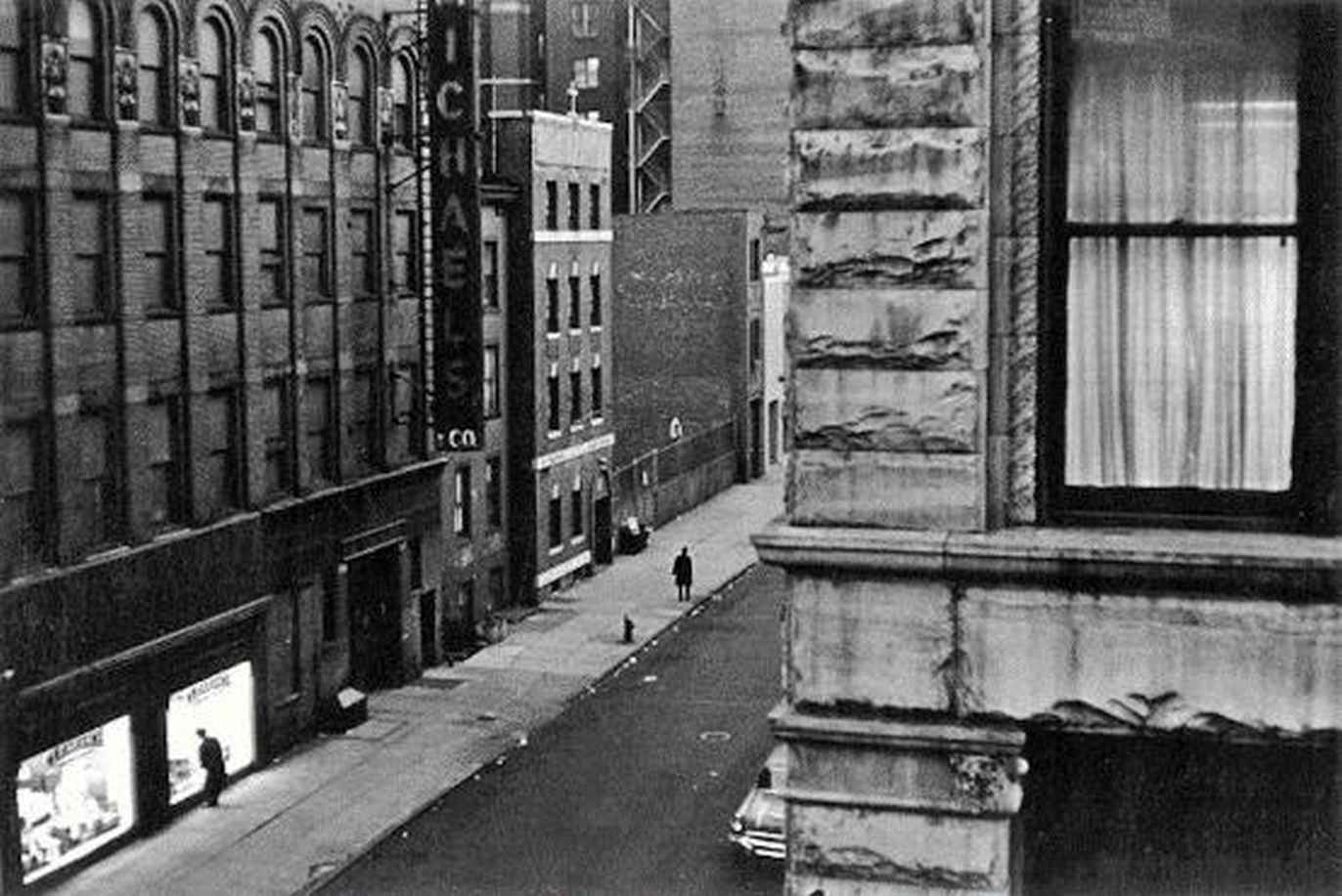 从摄影师的角度来看,临街窗户是一种生存于世而又不置身其中的方式。你退而向内,仍可继续方便地监控街上的推撞和拥挤。简·雅各布斯(Jane Jacobs)在《美国大城市的生与死》(The Life and Death of Great American Cities)中写道:“街上一定有双观望的眼睛”。这一观点吸引了威廉·格德林,他特意将之记在笔记本上。他也转录了卡夫卡有关孤独的人如何因“一扇临街的窗户”而使生活变得可以忍受,这扇窗不能是空寂的,必须充满人的活力。这是对孤独相互作用的视觉化:孤寂只有依据他人来表达。为了唤起卡夫卡式寂寞的独处,艺术家需要发现一个替身:街上的路人。格德林在其布鲁克林公寓拍摄的照片对此进行了明确的诠释[49]。照片的上部三分之一处是一扇街对面的窗户:格德林既可望出去,又可反映他的世界。余下三分之二的空间展现了空旷的街景,除了一人在注视商店橱窗,以及一个在人行道上的侧影。
