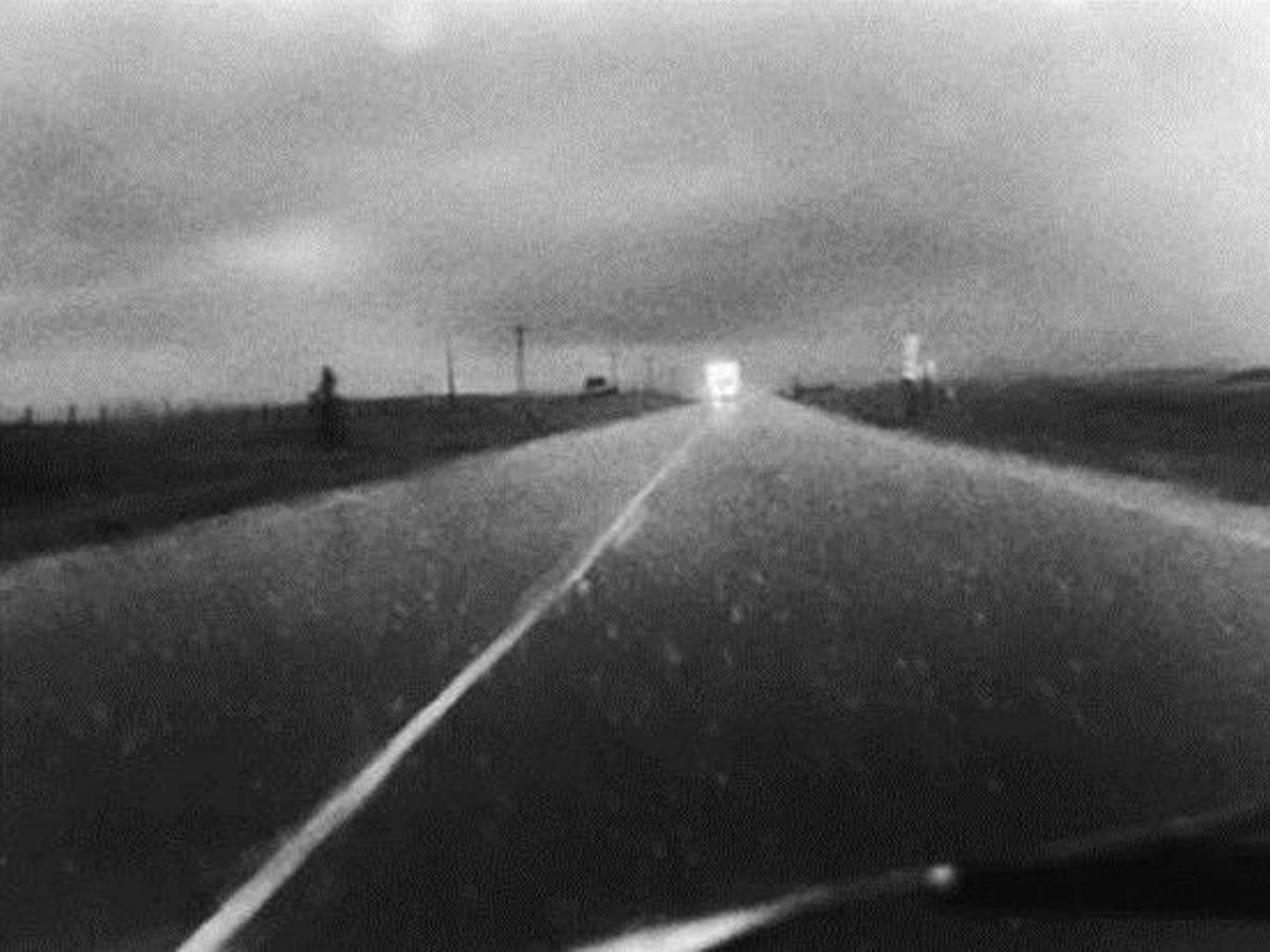 迅速回顾一下:兰格拍摄开阔的大路;弗兰克拍摄了几乎同样的夜路;温诺格兰德透过汽车挡风玻璃拍摄了好几幅……在一幅未标时间的照片中,奥默罗德透过暮光中雨迹斑斑的挡风玻璃注视着道路[54]。一辆白色卡车,灯光在雨中有些模糊,从另一方向驶来。灰色的云低垂下来。下一秒,雨刷不是刷清画面,就是将挡风玻璃刮擦模糊。