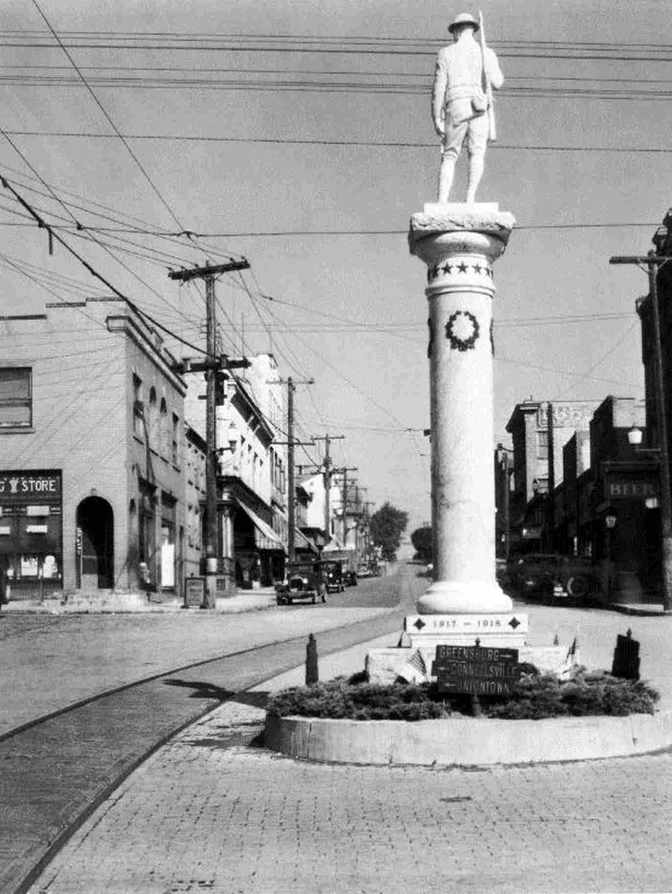 埃文斯不断使用这种后退视角来表明:甚至连时光流逝都不是趋势。在1936年的宾夕法尼亚小镇,电车轨道追随大街直到远处[76]。除了一些泊车,大街没有生命迹象;除了鬼影般的行人在人行道走动外,没有任何动静。占据整个照片的是一个无名士兵的雕塑,在随意纵览整个无人的街道,防范一个不存在的威胁。事实上整个场景都以这个纪念碑的视角在观察。这座雕像大概建于20世纪20年代,也就是照片拍摄的几年前,但实际时间却需要追溯到刻在碑底的年代:“1917—1918年”,这也提供了判定的依据。按理说,彼时它的建造甚至还未被构想。由此,我们在各方面被拉回过去,而泛黄的照片本身则加深了这一印象。