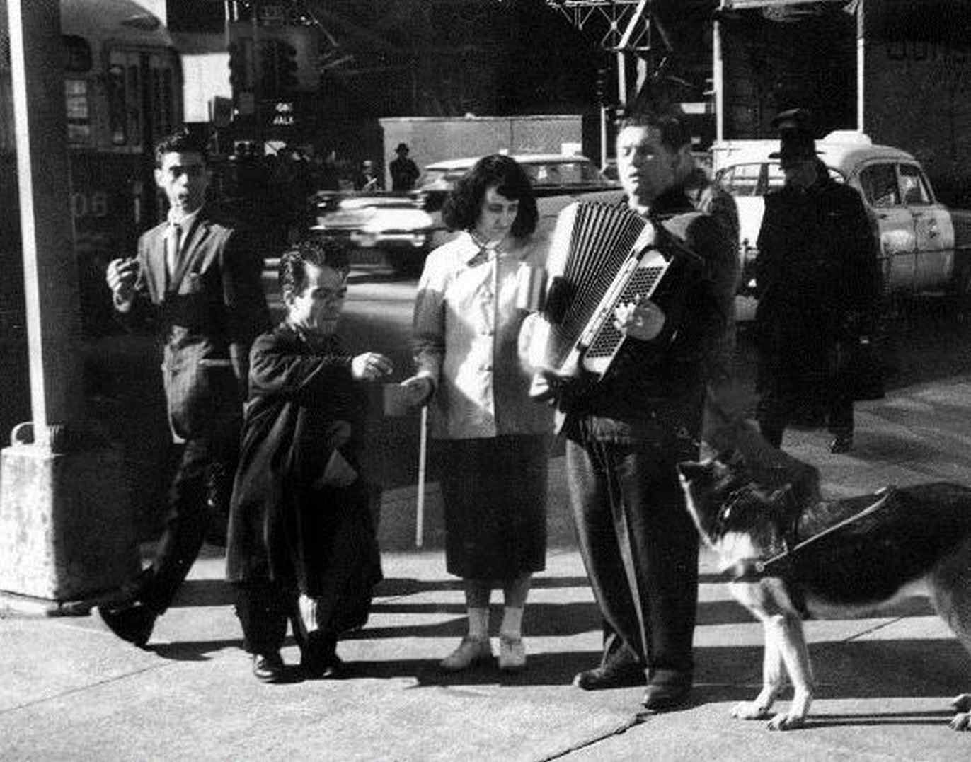塞尔特斯印象中的照片是在匈牙利的艾斯特根拍摄的,且那人并非盲者(他戴着眼镜而不是墨镜)。那架手风琴似乎是如此强有力的失明象征,让我们无视——我也曾经以为他是盲人——演奏手风琴人的真实状况[8]。1916年,柯特兹在二十二岁时拍摄此照。1959年,他在纽约拍摄了另一位手风琴家,这次拍摄的确实是位盲人[9]。这种景象就会抓住黛安·阿勃丝的眼球,这位手风琴家由导盲犬和一位盲妇陪伴,她手里拿着小杯子,一个路过的侏儒投入硬币。前一幅照片的背景是一面脏乱破裂的粉刷墙;而后一幅照片则是第六大道的喧哗街景:众多汽车,擦肩而过的牧师,还有一位行人,手上拿着烟,眼睛瞥向该场面。实际上,这两幅照片贯穿了柯特兹漫长而多变的摄影生涯的中心链。这其中,他拍摄了不少演奏手风琴的人[包括1926年拍摄的雕塑家奥西普·扎德金(Ossip Zadkine)]和一些盲人音乐家,最有名的是1921年在阿本尼拍摄的《流浪小提琴家》(The Wandering Violinist)。为了营造视觉上的和谐,他们建立了三联体,手风琴、小提琴和盲人。音乐唤醒了一种失明感或是缺失感——那种既痛惜又有所补偿的缺失。