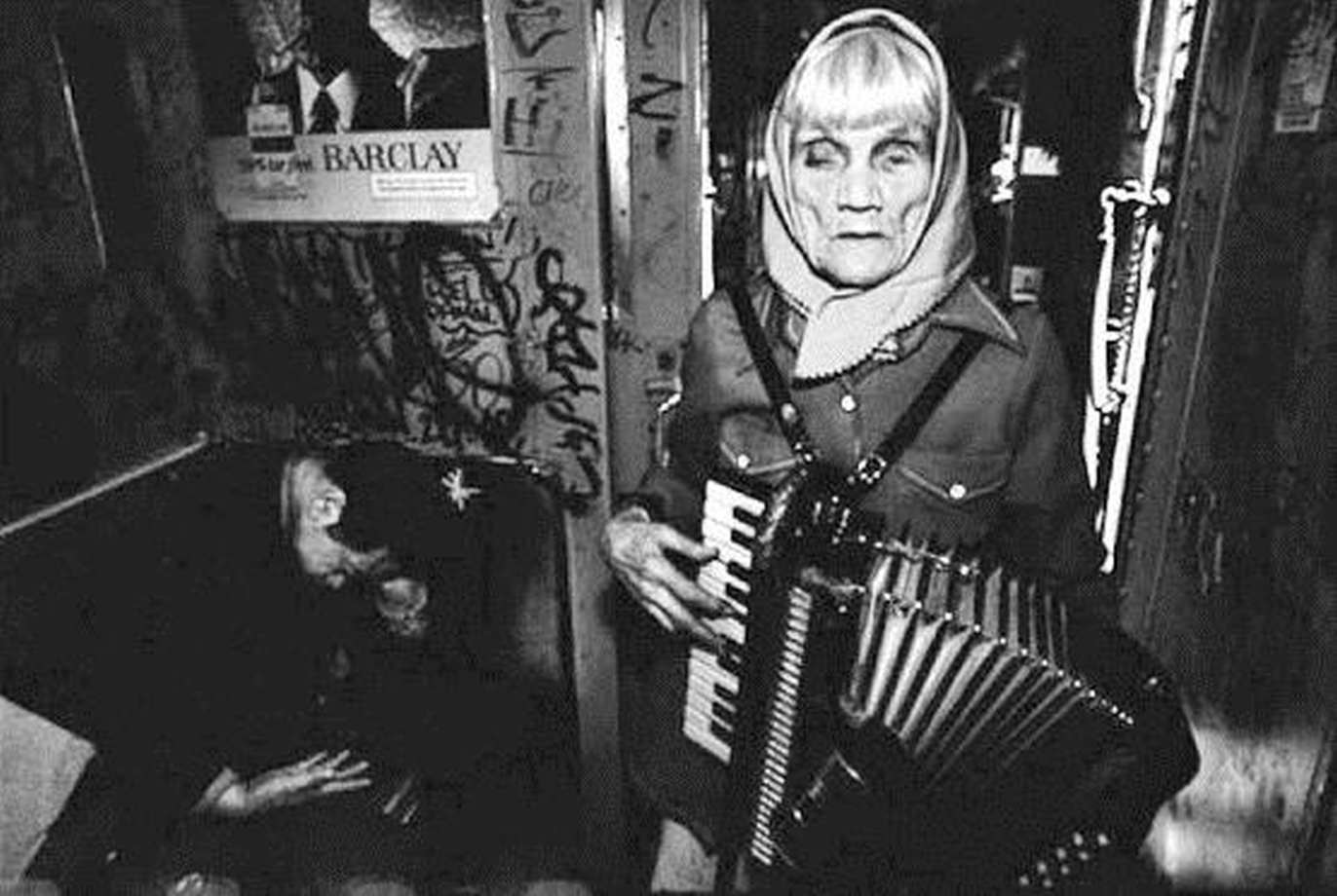 戴维森大概知悉埃文斯先前的地铁作品,就像埃文斯也觉察到斯特兰德的先前作品一样。他也一定知道,失明的街头艺人在地铁走道里拖着脚步进入镜头,只是时间问题。结果是一种意外的融合,是对戴维森杰出的前辈们所摄照片的一种含蓄评论。一个穿着绿色外套的女人背向覆盖着涡形和环形涂鸦的地铁车厢门站着[6]。她右边有一位乘客跌坐在座位上,用手托着头,不是精疲力竭就是喝醉了。街头艺人头裹橄榄色围巾,衬托出她满是皱纹、坑坑洼洼的脸。她看上去好像是坐上了通往地狱的列车一般。她的一只眼睛斜眯着,毫无生气;另一只眼睛直直地看着前方,她在弹手风琴。(6)与斯特兰德、海因、温诺格兰德拍摄的盲人不一样,埃文斯和戴维森拍摄的盲人脖子周围并没有表明其为盲人的标签。或者说他们的标签是笨拙的音乐——如果不是失明,那么手风琴的音乐要表现什么?