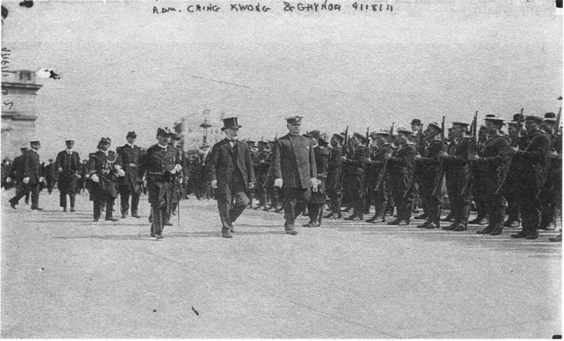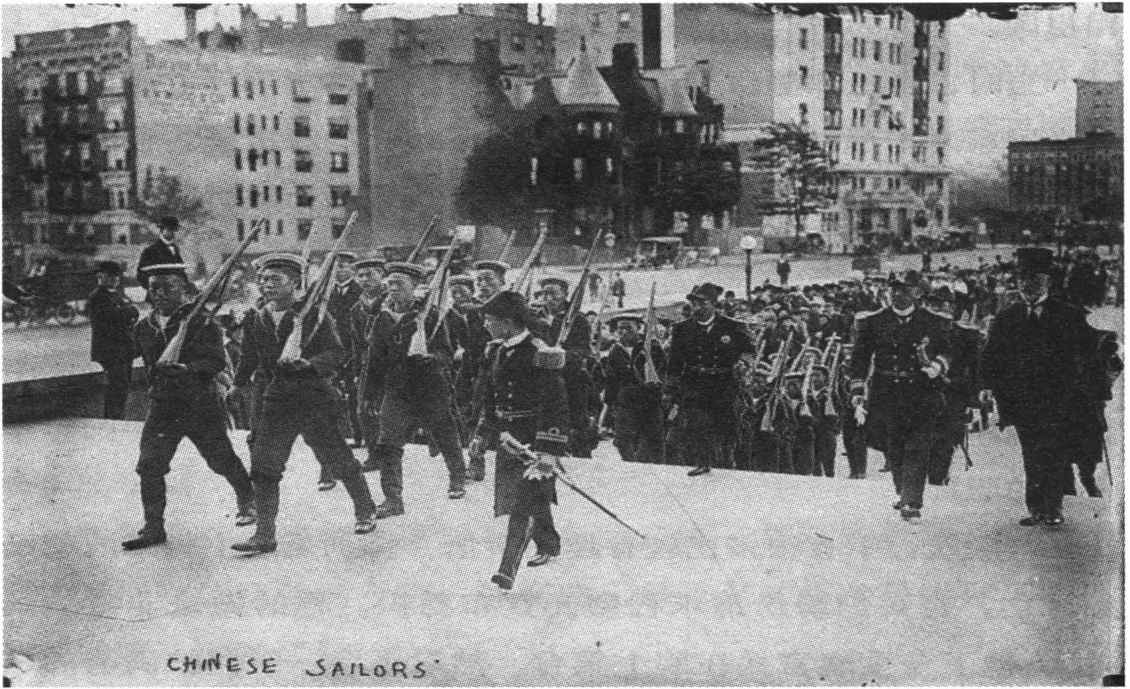 ◎程璧光陪同纽约市长盖诺尔和格兰特的儿子小格兰特将军检阅中国海军仪仗队,请注意水兵们都剪了辫子。这大约是中国海军第一次在美国进行阅兵