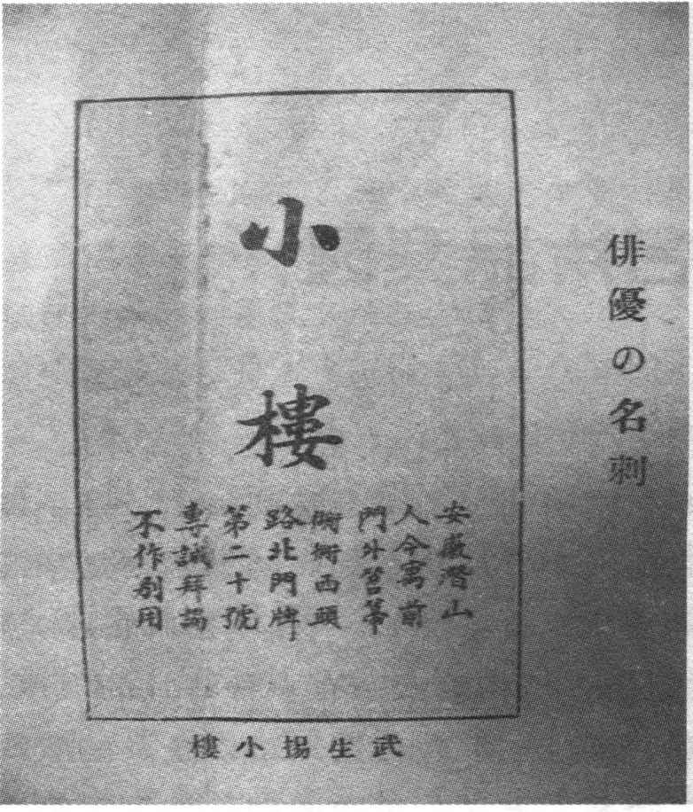 杨小楼的名片不印姓,只印“小楼”二字,下面则是杨小楼自书的小注,文曰:“小楼,安徽潜山人,今寓前门外苕帚胡同西头路北,门牌第二十号,专诚拜谒,不作别用。”