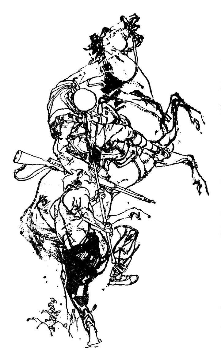 “快,快走!”他一手握着长矛,一手抓着我的胳膊,把我用力向坡下一推,于是,我就顺着西山坡,骨碌碌直滚下来。当我滚到半山坡,站起身来,向岭上望去时,我看到山岭上出现了两个骑兵,那个光膀子的人,正挥舞着长矛,向着前面的那匹马的前胸刺去,那马忽地前蹄腾空,嘶叫了一声,就顺着山坡滚下去。但紧接着,第二个骑兵,却把马一纵,直向着那光膀子农民冲去,那农民一下子扑倒在地,接着,又有几个骑兵,纵缰驰马,从那农民身上奔了过去……