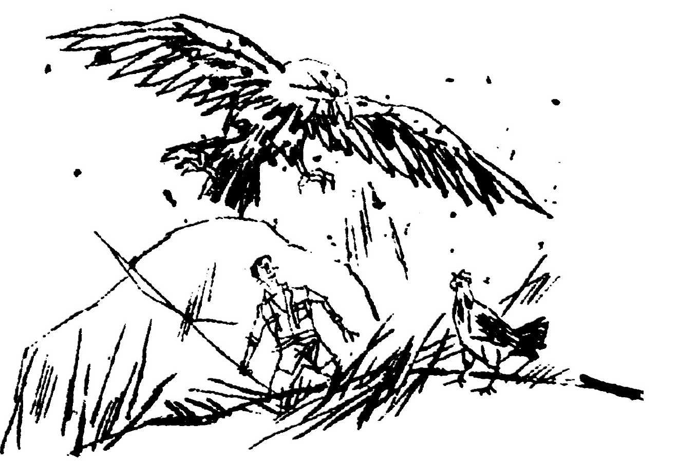 蓦地,我发现在山坳处,那只老鹰正在贴着树梢潜行,小黄鸡不知是吓呆了还是没察觉,仍然呆立着,而且竟还往地上啄食。我连忙拿起牛鞭嗖地蹿起来,但这时已经迟了,老鹰呼啸一声,利剑一般展翅直插小黄鸡。就在老鹰即将着地的一刹那,小黄鸡突然机灵地“咯”的一声尖叫,猛地一闪身,钻进荆棘丛。瞬间,我耳边传来“嚓”的一声,只见老鹰在地上扑腾着,跳跃着,挣扎着,小黄鸡在荆棘丛中探出头,心有余悸地惊叫着,其余小鸡蛰伏在草丛中,动也不敢动。我连忙奔过去一看,原来老鹰在俯冲抓小黄鸡时,大概是被激怒了的缘故,忘了把握它的高超的擦地时的“U”字形飞行的绝技,更忘了它在空中可以用翅膀刺杀鸽子后刹那间再用爪子捕捉的绝招,忘却了对付地面的鸡只能偷袭,并且要在掠过地面时用爪子闪电般地抓住捕捉物,而决不能用翅膀劈杀!它上了小黄鸡激将法的当,折了翅膀,因而造成了悲剧。