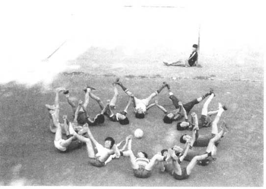 这个人围成的圈是为了我们的告别,大学四年,除去宿舍和教室,体育场是我们待的时间最长的地方,一只滚动的足球把我们的青春和友情都凝聚其中,要散了,我们这支球队就在空旷的球场上来了最后一次的团圆,你猜,哪一个是我?