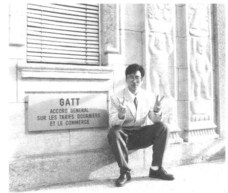 这张照片拍于日内瓦的关贸大楼前,牌子上的GATT即为关贸总协定的缩写,现在这四个字母已被WTO取代,世界贸易组织依然在这栋楼里办公,我一直盼着,能第三次再进这栋大楼,去进行中国加入WTO的报道。