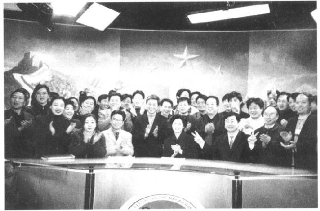 这是直播结束后演播室内的“大团圆”,虽然台长们和很多领导都在,可我们三个主持人还是被按在主持台上,我明白,我们是这次节目的记忆符号,但我更明白,没有众人没白天没黑夜地苦干,又怎能有屏幕上我们的笑脸相送呢?