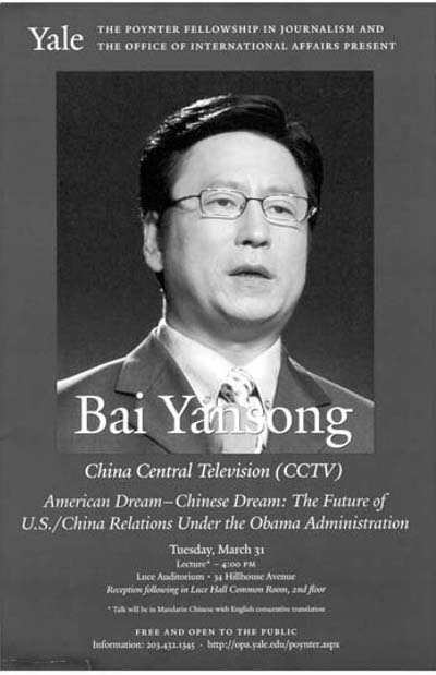 这是耶鲁大学校园里张贴的海报,上面印着我的大头像和演讲主题:美国梦,中国梦。