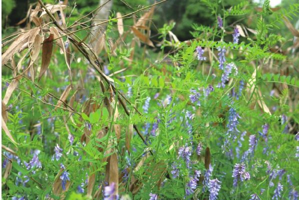 “上山采药,挖野菜。山里的金银花快开过了,没见到紫色的,都是黄白相间,香味依然浓烈,藤攀得很高,都在荆棘丛里,脚下火麻和雀不站[2]特别多,是伤肤利器。坟边两株合欢树,独木成林,林子里四处飘着白色的花朵。采了蕨菜、鹅脚掌、土参叶。立夏了,只觉蝉鸣更厉害,树木却闻不见浓郁的清香味。眼前一切,仍是收敛的。在院子里看猫晒太阳打滚。”