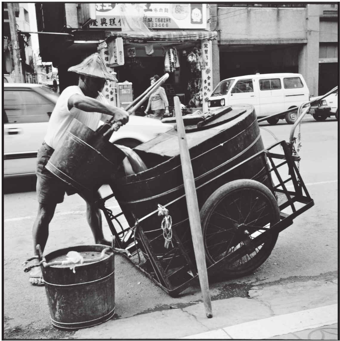 拍这张照片时,我三十七岁;到了现在,看事情的角度又不同。世间万象,真正的贵贱美丑不能光看表面。许多绚丽堂皇的东西,实质上却在侵蚀着善良美好的根本。就拿水肥车来说吧,为了要不漏不坏不烂、经得起风吹雨打日晒,必定得用上等木料制作;而众人嫌弃的秽物,在几百年的传统农业中维护了土地的生气与养分,在今日被称为有机肥。不臭不脏、效能惊人的化学肥料时兴后,却对生态环境、人类健康造成无法弥补的伤害。