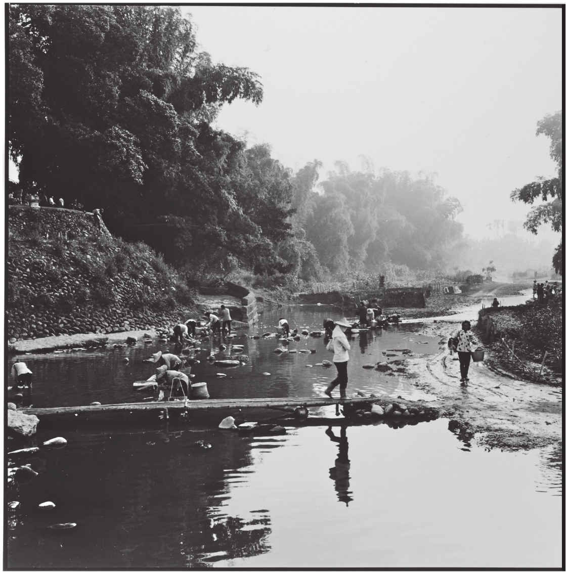 这个画面,我先用135相机拍了一张,可觉得2:3的长方形比例不够开阔,于是小心翼翼地换上刚买的120瑞典哈苏相机,在同一个位置耐心等候,于溪面清晰映出上工女子的倒影时按下快门。