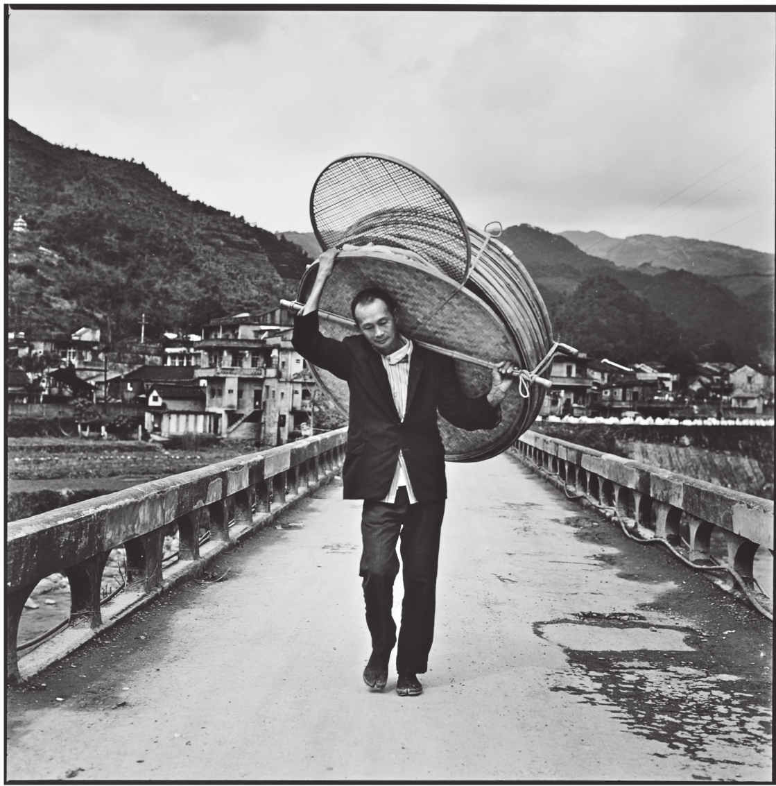 我站在尾桥眺望溪谷景色,只见一位茶农扛着一大摞茶叶簸箩缓慢地走过来。看来已经走很久了,物件体积那么大、那么重,瘦长的身子却平衡得很好,每一步都跨得很有技巧,以至于气定神闲、姿态优雅,一点也不像是在从事粗重的劳作。
