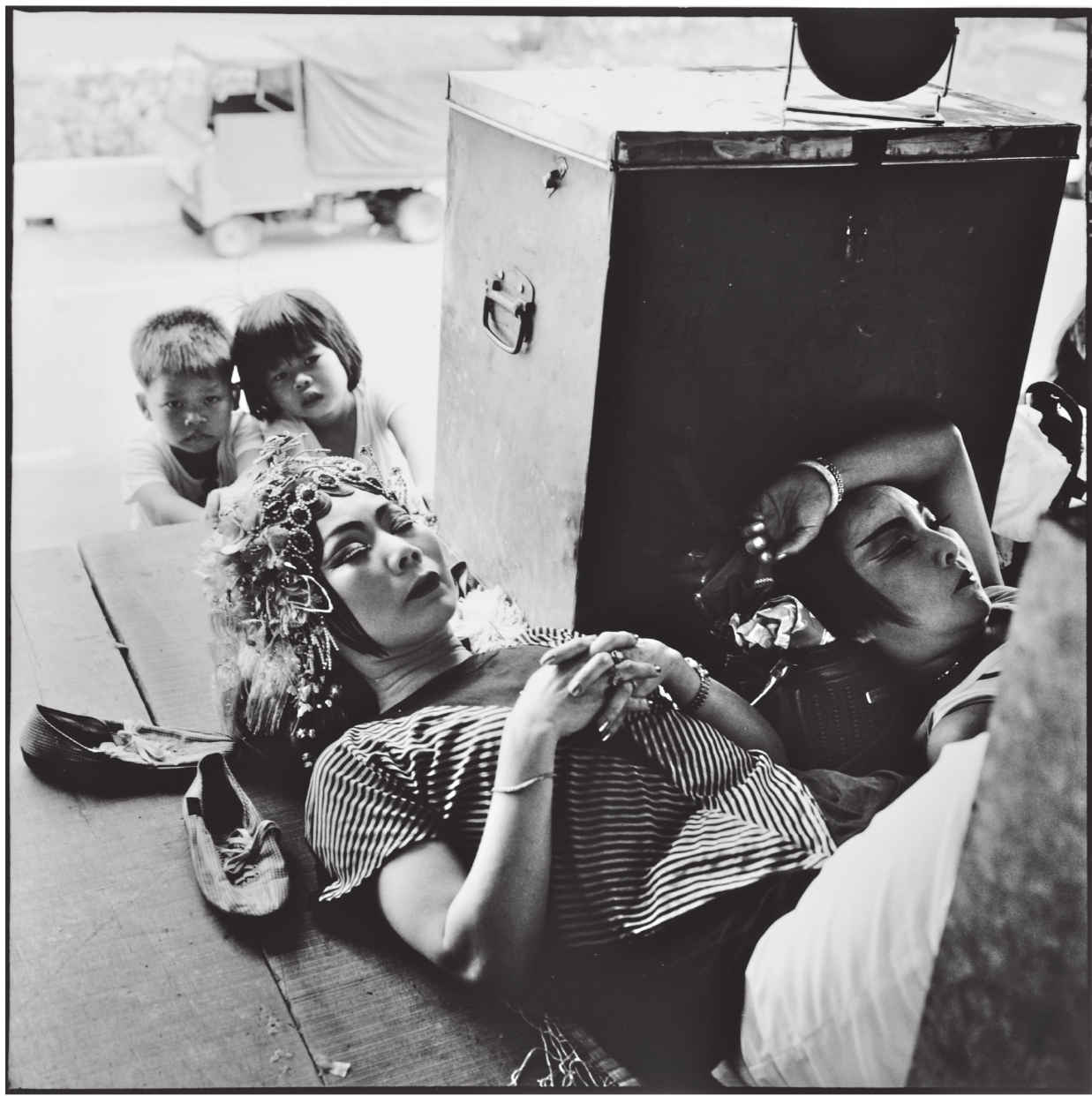 戏班子披星戴月地赶场,早练就了随时随地打盹、进食的本领。那天不知要演几场,演员们妆扮费时,看来得从早到晚顶着浓妆过一天。假寐中的花旦、青衣,戏装已换成了便服,可是从头饰、妆扮上,仍然可以看出谁是夫人、谁是丫鬟。