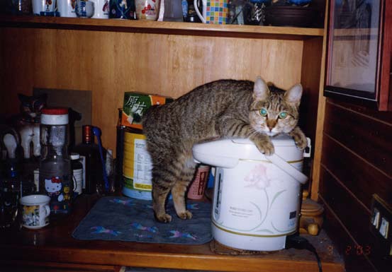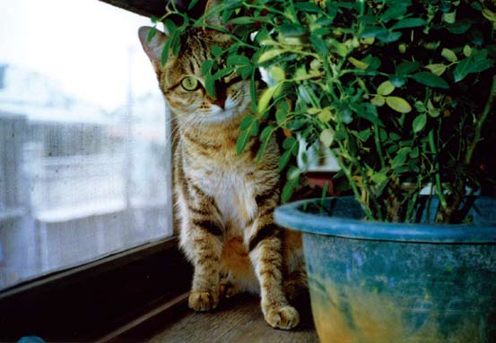 后来与超市潘老板说起,才知道原来纳纳天天与他们放野养在绿地一只名叫“三杯兔”的大黄胖兔厮混一处(顾名思义,是潘老板从友人口中抢救下来的),那潘老板与动物(包括他自己不满三岁的一子一女)相处方式和我们颇近似,小孩不上超市隔壁的美语幼儿园,天天赤足晒太阳尾随父亲在有限的绿带草丛抓虫玩泥巴,潘老板说,他每蹲在那儿莳花培土,老觉有一对猎捕眼睛在盯他,后来发现是一只藏身长草灌木中的小花猫(我们对了一下,确定小花猫就是纳纳),但纳纳打算猎捕的对象并不是他,是体积大自己三倍的三杯兔,那三杯兔成天只顾忙着挖地道谁都不理,包括三不五时箭矢一样从它背上跃过的纳纳,也不怕偶尔会跳骑到它背上想法咬咽喉的纳纳。天黑潘老板会把三杯兔收进铁丝笼中,铁笼不知原先做啥用的,其上有一层阁楼夹层空间,那纳纳不待邀请就自动住进去,三杯兔在楼下理毛,纳纳楼上也理毛,那真是一段快乐纯真的伊甸园时光!