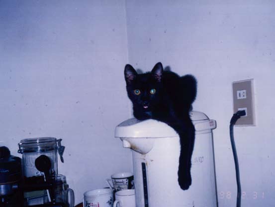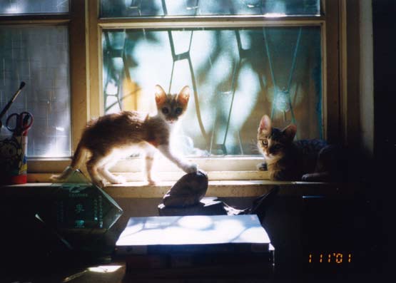 便也有麻瓜出走半年后的台风前夕,同一个小女孩又从学校抓了一只灰色虎斑小狸猫打算偷偷塞进我们信箱就跑人,终究小猫的尖声哭叫引得我们出门探看,我们给她取名纳莉(台风),小名纳纳,一个月后,纳莉升格做姊姊,来了一只更小的白腹黄背小公猫,取名APEC,是邻居改建老屋工人在冷气口抓来的,APEC果又是天文会爱上的那种哭兮兮、爱告状的跟屁虫,小名哭包头。