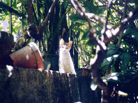 每每以为整个山坡的猫口已被我们控制妥了(家中的、附近流浪的,皆被拐去结扎),就不知哪天坡底巷口出现一只苗条的三花玳瑁美女猫,她常专注坐在爱钓鱼的邻长家门口看他们大门敞着院子里杀活鱼,不时分得一些鱼肚肠,因此不怎么热中我们喂食她的猫饼干。她照例(依她的花色)不怕人也不黏人,既独立又聪明,因此稍一疏忽,见她什么时候肥了身躯涨了奶帮子,结扎,已来不及了。