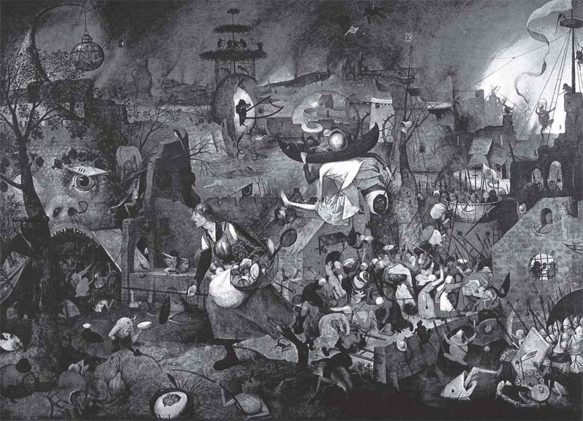布拉班特[1]的天才画家老彼得·布吕赫尔(Pieter Bruegel the Elder)的作品《疯狂梅格》(Dulle Griet〈Mad Meg〉,1562年完成)中,出现了横跨于地狱之河上的无名小桥。在那座小桥上,戴着头巾身穿围裙的农妇们挥动着锄头、火钩和棍棒勇敢地与妖魔鬼怪搏斗。