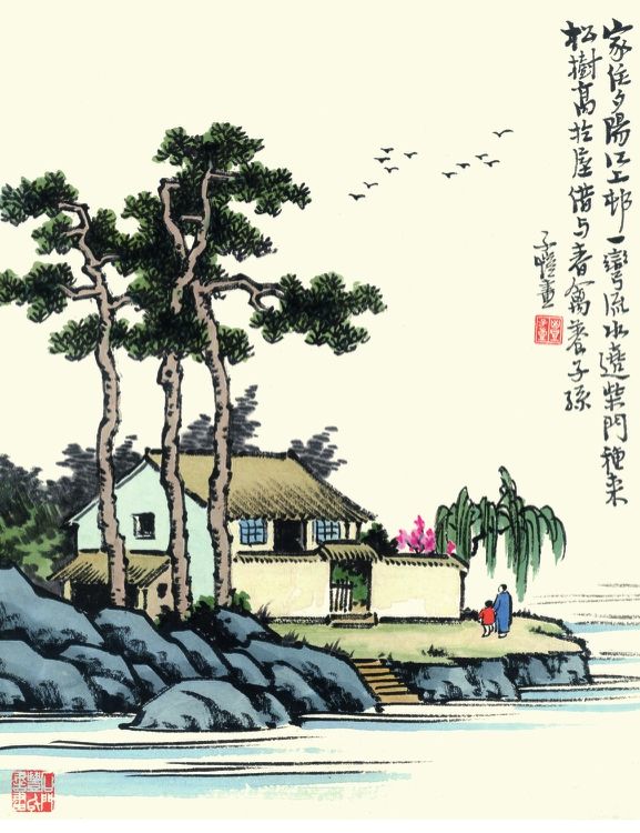 家住夕阳江上村 一弯流水绕柴门种来松树高于屋 借与春禽养子孙