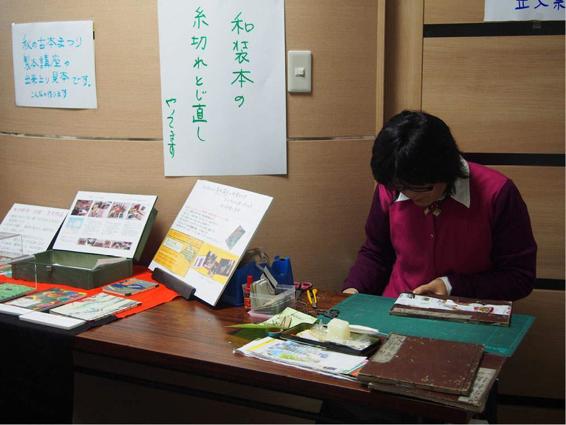 去年秋季古本祭,麻里夫人请我参加一个手工做书的活动,很有趣。当日秋雨连绵,书摊照旧摆着,顶上罩一层防雨布。活动在阿弥陀殿内举行,老师和参与者围坐矮桌前。麻里夫人里里外外照料,不时到自家摊前招呼。我在门里远远看着,顿有光阴漫漶之感。