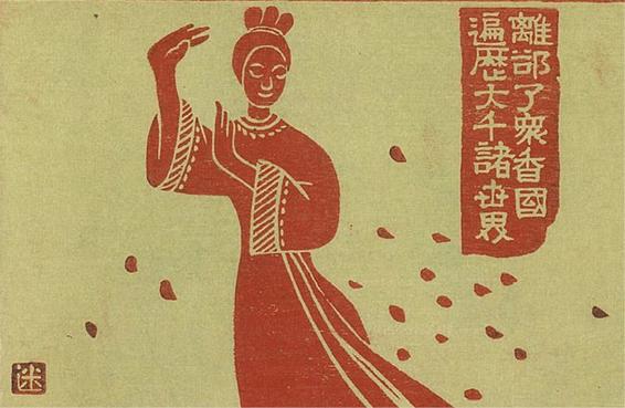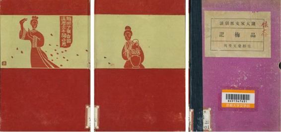 (二)、《品梅记》(诸大家支那剧谈),京都汇文堂刊,大正八年(1919)印刷发行。小三十二开本,梅红函套,书封正背面有两幅版画,正红底色,绘梅兰芳天女散花,“离却了众香国,遍历大千诸世界”。有“迷”字钤印,似为青木正儿所作。馆藏乃铃木虎雄所赠。