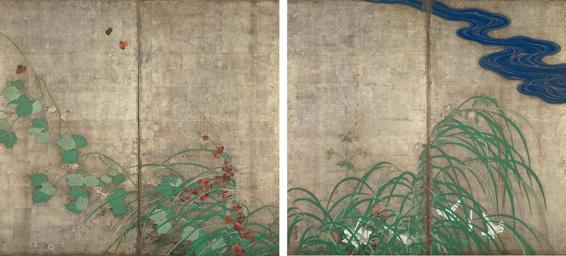 艺术类有浮世绘、春画、日本画等,画质极佳,也有以前未公开的作品,很有收藏价值——《别册太阳》宗旨即是“照亮永远的过去与未来”。买过一册《酒井抱一》,内有大幅《夏秋草图屏风》(又名《风雨草花图》),并附该图草稿。酒井抱一(1761-1829)是江户时代后期的绘师、俳人,继承尾形光琳的优雅画风,为江户琳派的创始人,画风洒脱,有文人意趣。《夏秋草图屏风》左右二幅,左为骤雨中的夏草,右为强风下的秋草,满纸流风,气势浑然。夏草有芒草、百合、剪秋萝、旋花、女郎花。秋草有芒草、爬山虎、葛、泽兰,其中芒草、女郎花、葛、泽兰均属秋七草。《万叶集》有山上忆良两首和歌:“秋野花开,折来细数七种花。”“萩之花,尾花,葛花,瞿麦之花,女郎花,藤袴,朝颜花。”日人欣赏的植物与我们不大相同。中国诗歌、绘画中最常见者,如梅、兰、牡丹、松、竹、芍药、石榴、玉兰、菊等,清雅端丽,各有品格。而日人爱咏爱画的植物,大多纤弱细柔,亦颇合他们的传统审美。