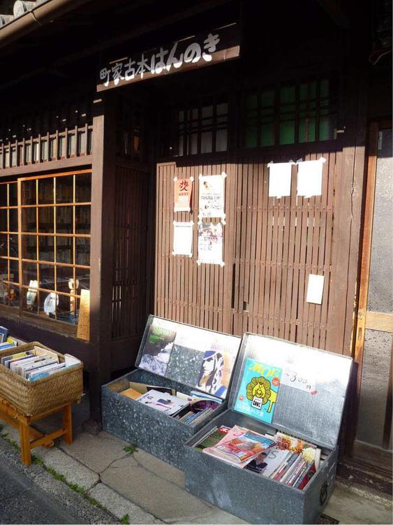 寺门南面的小巷里有一家旧书店,乍一看很不起眼。典型的町家民居,木格窗,推拉门,二楼的“虫笼窗”——町家建筑二楼的通风窗口,饰以涂过灰浆的纵向细木条,好似虫笼。廊下摆着几只装满特价书的木箱。檐下有一块木牌,写着店号:町家古本はんのき。若不是门口挂着“营业中”的招牌,我真不敢拉开木门,打扰这样静谧的民宅。