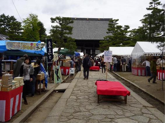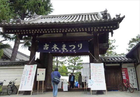 秋之古本祭在10月末11月初,前后也五天。地点是百万遍知恩寺,又云“古本供养・青空古本市”。知恩寺乃净土宗七大本山之寺院,本尊阿弥陀如来,号长德山功德院百万遍知恩寺。法然上人曾数番至此。他圆寂后,爱徒源智于建保年间(1213年左右)筑御影堂,称知恩寺。后醍醐天皇时代,元弘元年(1331),京都瘟疫横行,死者遍野。天皇敕命知恩寺第八住持善阿空圆上人祈祷疫病退散。上人到宫中,七日间念佛百万遍,果然退散疫情。天皇遂赐“百万遍”之号与宫中秘藏的弘法大师亲笔利剑名号及大念珠于知恩寺,如今寺旁尚有百万遍念佛根本道场。