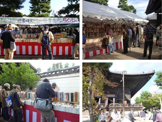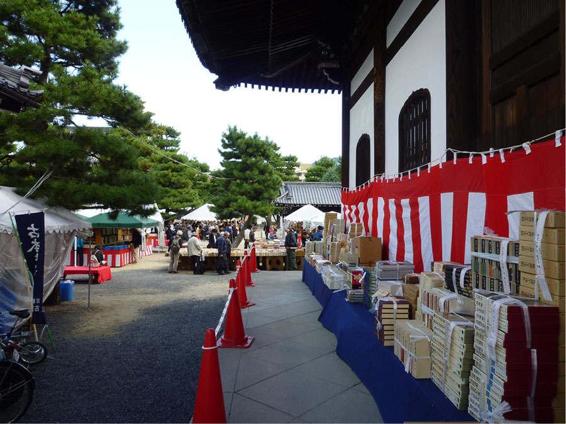正殿左侧的阿弥陀堂回廊内外堆满各家书店推出的套书,每一捆都系着纸签,表明书目与某家书店名。有些未标价的,客人可自携此签到该店问价。套书品相皆佳,乃各家精品。如京都学派诸家全集、文集,古典文学大系,近代文学诸家全集,正仓院画册等等,琳琅满目。我刚瞧见1951年手稿影印的《鲁迅日记》,踌躇是否要买,某师兄道,且查查孔夫子的价格再说!忽听寺院北首人语喧嚷,耳朵内刮入“东洋史”三字,立刻与师兄奔去看,原来是拍卖会。