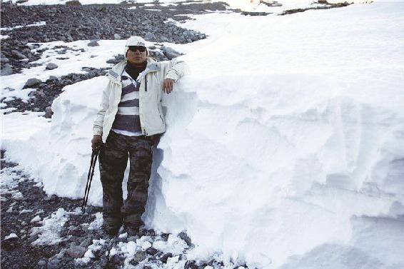 因为有冰的缘故,平时三小时的路,我们走了6个小时,11点时,还未到山口。两个藏民脸上呈现着焦急的颜色,催促我们加快脚步。我不知道他们为什么这么着急,跟他们解释说,真的走不起来。慢慢地,我们被两位藏民落下很远。我们眼睁睁地看着他们的背影在山口消失,心里并没有慌,只是莫名其妙为什么这么心急?直到我和上师快到山顶,脚下的冰冒出水来后,我才隐约感觉到,两个藏民快步走的原因:冰已融化,如果你停下来,静静地听,就能听见冰下面有水在汩汩流淌。这时候还不走,很可能会有生命危险。我这才明白两位藏民着急的原因。到达山顶,向下看,一片银色世界,我用脚试了下雪的硬度,一脚踩空,腰以下全都在雪里了。