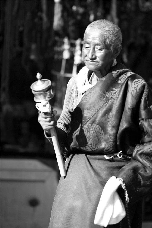 不记得是哪一年,我在大昭寺中看到一对藏族老人,他们衣服灰暗,面色苍苍。稍有常识的人就知道,他们来自遥远之地。历尽千辛万苦的唯一目的,只是来大昭寺朝圣。他们在大昭寺中每一座佛像前都跪拜下去,虔诚得令人肃然起敬,我从他们的眼中看到,他们心中只有佛,来往的人群在他们眼中就似空气。