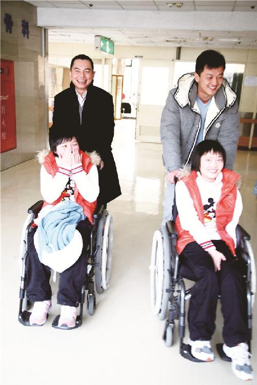 与李亚鹏一起看望两个经历汶川大地震后康复的女孩。