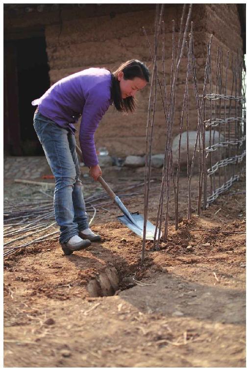 于是,我花了一天的时间捡枝条、运回小院。扎篱笆看似简单,过程却也并不容易。首先把扎篱笆的线画出来,做标记。然后沿着线挖出一道坑来。坑的深度得正合适,如果太深,高度有限的树枝放进去就变矮太多,如果太浅,树枝就会固定不稳。有的土地特别坚硬,要去下面的小河里拎一桶水浇进土里,土质变松软后再开始挖。