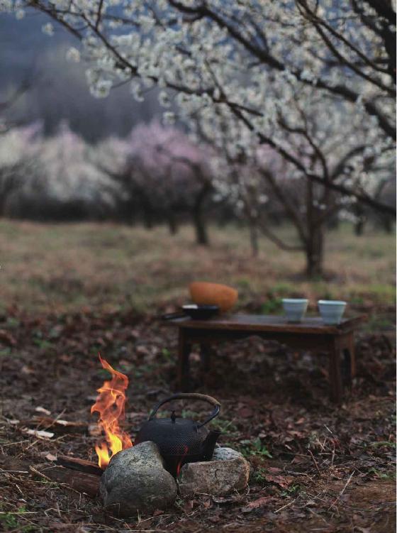 这时的樱桃花开得正好。干活累了,就席地而坐,沏一壶茶。