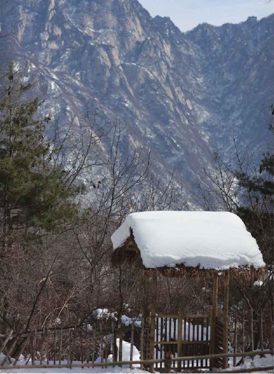 不说别的,光茅棚的篱笆山门就是一道风景。山门大都就地取材,木头做桩,将粗细均匀的竹子一根一根密密地排列固定,扎成左右对称的两扇门来。再向左右延伸出篱笆,围住房屋,雅致的感觉就出来了。其实篱笆门是很容易推开的,有的上面也会挂着“闭关修行请勿打扰”等字样,有修养的人看到牌子是绝不会兀自推开的,只会转身离去不以打扰。偶尔也不免有粗鲁之辈,无视以上种种直接推门而入。所以住山人戏称这道门是“防君子不防小人”。但这并不妨碍住山人的雅趣。