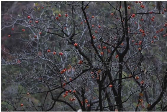 枝头的野柿子变红了,它们即将成为最可口的美味。