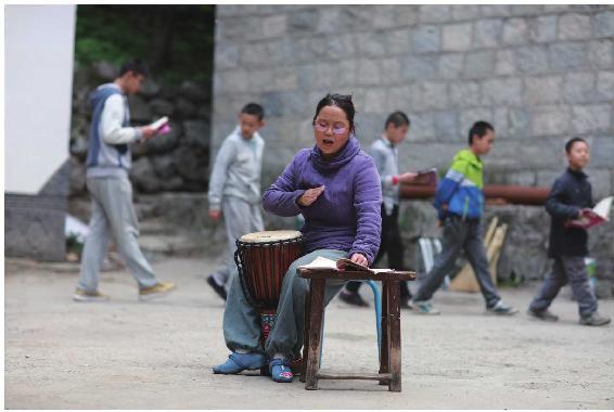 用手鼓的鼓点配合诵经学习,每一位学生都积极的参与其中。
