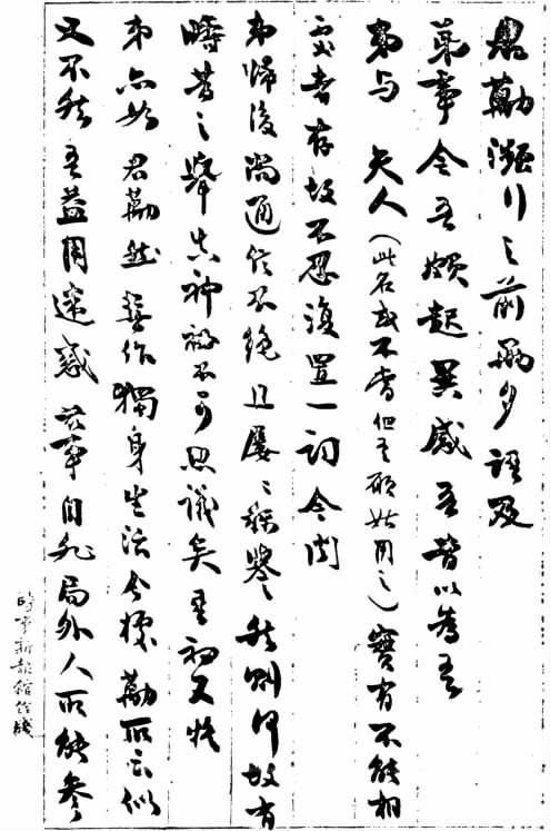 君劢濒行之前两夕,语及弟事,令吾颇起异感。吾昔以为吾弟与夫人(此名或不当,但吾愿姑用之)实有不能相处者存,故不忍复置一词。今闻弟归后尚通信不绝,且屡屡称誉,然则何故有畴昔之举?真神秘不可思议矣。吾初又疑弟亦如君劢然,喜作独身生活,今据劢所云,似又不然,吾益用迷惑。兹事自非局外人所能参末议,然以吾与弟之交,有两事不能为弟忠告者:其一,人类恃有同情心以自贵于万物,义不容以他人之苦痛易自己之快乐,弟之此举,其以弟将来之快乐能得与否,殆茫如捕风,然先已予多数人以无量之苦痛,重闱之悲诧,微,君劢言吾亦可以推想得之,君劢家之老人,当亦同兹感。夫人或与弟同怀抱所痛灭杀(?)然最难堪者两儿,弟既已育之,胡能置之,兹事恐弟将终身受良心上之重罚无以自宁也。其二,恋爱神圣为今之少年所最乐道,吾于兹义固不反对,然吾以为天下神圣之事亦多矣,以兹事为唯一之神圣,非吾之所敢闻,且兹事尽可遇而不可求,非可谓吾欲云云即云云也。况多情多感之人,其幻象起落鹘突,而得满足得宁贴也极难,所梦想之神圣境界,恐终不可得,徒以烦恼终其身已耳。呜呼。志摩,天下岂有圆满之宇宙若尔尔者?孔子赞易无取,以未济终矣,当知吾侪以不求圆满为生活态度。斯可以领略生活之妙味矣。吾以为人类对于两性间相互最好是以“无着落”之态度行之(君劢最能如此,吾亦颇如此。),则最少亦可以减无量苦痛。吾固知弟为富于情感之人,未易语此,然吾自审吾之情感并不视弟为贫弱,吾固有与弟言此之资格也。呜呼。志摩,当知人生树立甚难,消磨甚易,如志摩之年,实一生最可贵之时期,亦最危险之时期也,若沉迷于不可必得之梦境,挫折数次,生意尽矣,郁邑侘傺以死,死为无名;死犹可也,最可畏者,不死不生,而堕落至不复能自拔,呜呼。志摩,A无愧!可无惧耶!吾与志摩相处之日殊浅,吾所虑者或皆不衷于事实,然吾之爱惜吾志摩者至厚,自闻君劢言后,耿耿于中,无一时能释。顷辍课来沪,夜中思此,不复成寐,披衣起,作此数纸。或非志摩所乐闻,然吾终望志摩知我对志摩用情之深,虽今日不寝,终有日能寝也。旬日后即北归,当约志摩就我,再罄其怀抱耳。惓惓之极,不尽欲言,专上