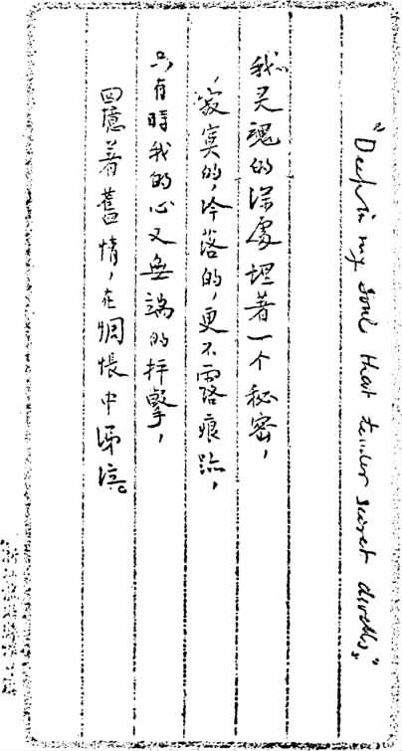编者按:该诗已收入《志摩的诗》(【全二】八九)。惟字句略有出入:第六行“涧泉幽抑了弦琴的声喧”排印稿作“涧泉幽抑了喧响的琴弦”。第八行“欢情的绻缱”排印稿作“翻飞的欢恋”。第二十六行“她纯洁的灵魂”排印稿无“她”字。第三十一行、三十二行“