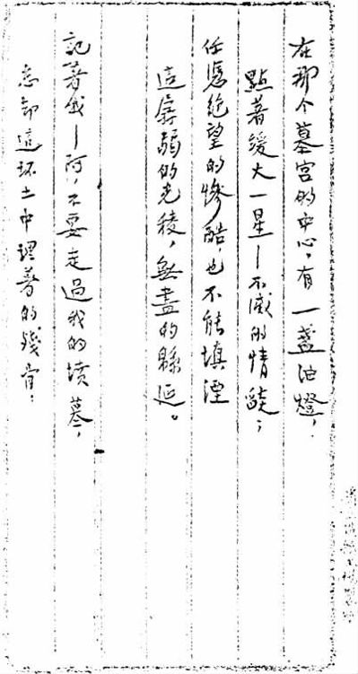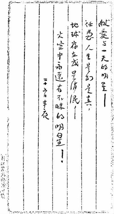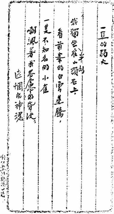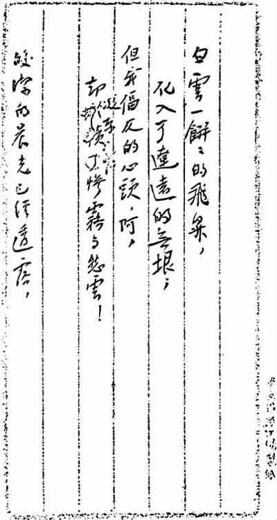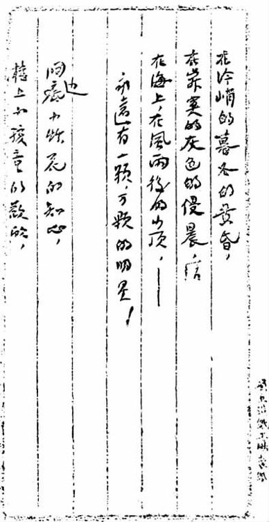 编者按:该诗已收入《志摩的诗》(【全二】四七)。惟题目“一星的弱火”排印稿作“一星弱火”,字句亦有出入:第八行“凝聚”排印稿作“凝敛”。第十行“洗净青屿”排印稿作“洗净了青屿”。第十二行“中心”排印稿作“胸中”。