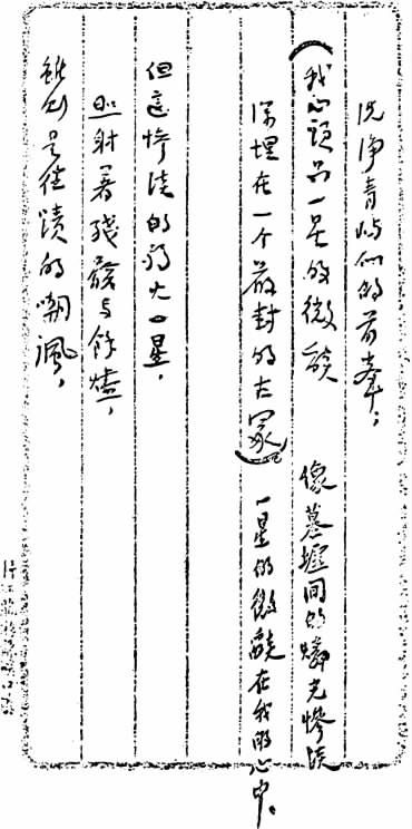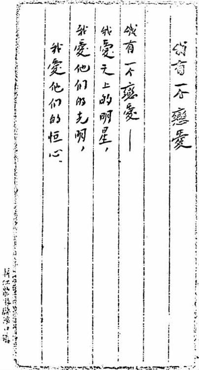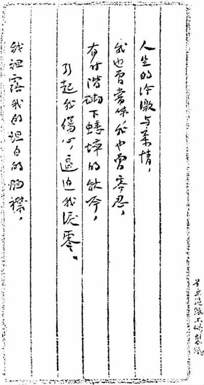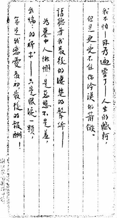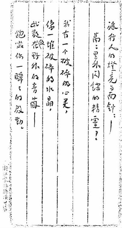 编者按:该已收入《志摩的诗》(【全二】六二)。惟字句稍有出入:第三行“光明”排印稿作“晶莹”。第四行“我爱他们的恒心”排印稿作“人间没有这异样的神明”。第六行“侵晨”排印稿作“清晨”。第九行“涧边”排印稿作“山涧边”。第十行“楼上”排印稿作“高楼上”。第十三行“心灵”排印稿作“魂灵”。第十五行“散放在野外的青茵”排印稿作“散布在荒野的枯草里”。第十七行“冷激”排印稿作“冰激”。第二十行“伤心”排印稿作“心伤”。